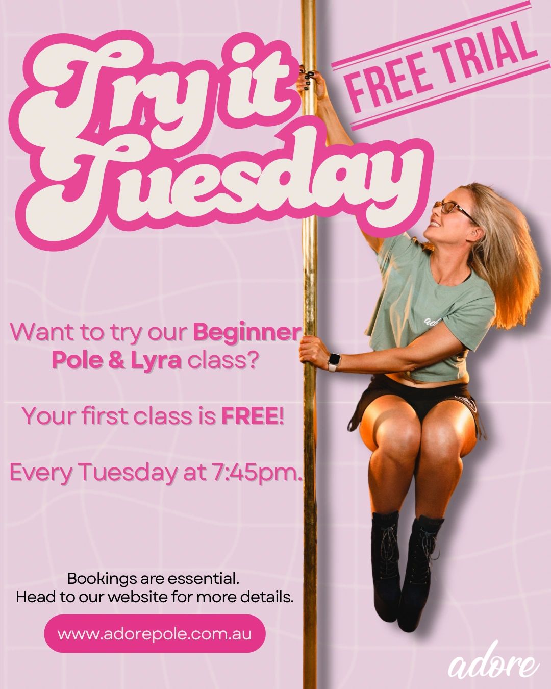 Our Beginner Pole & Lyra class is the perfect intro to both! You’ll get a feel for both pole and lyra in a fun, supportive space — no experience needed.